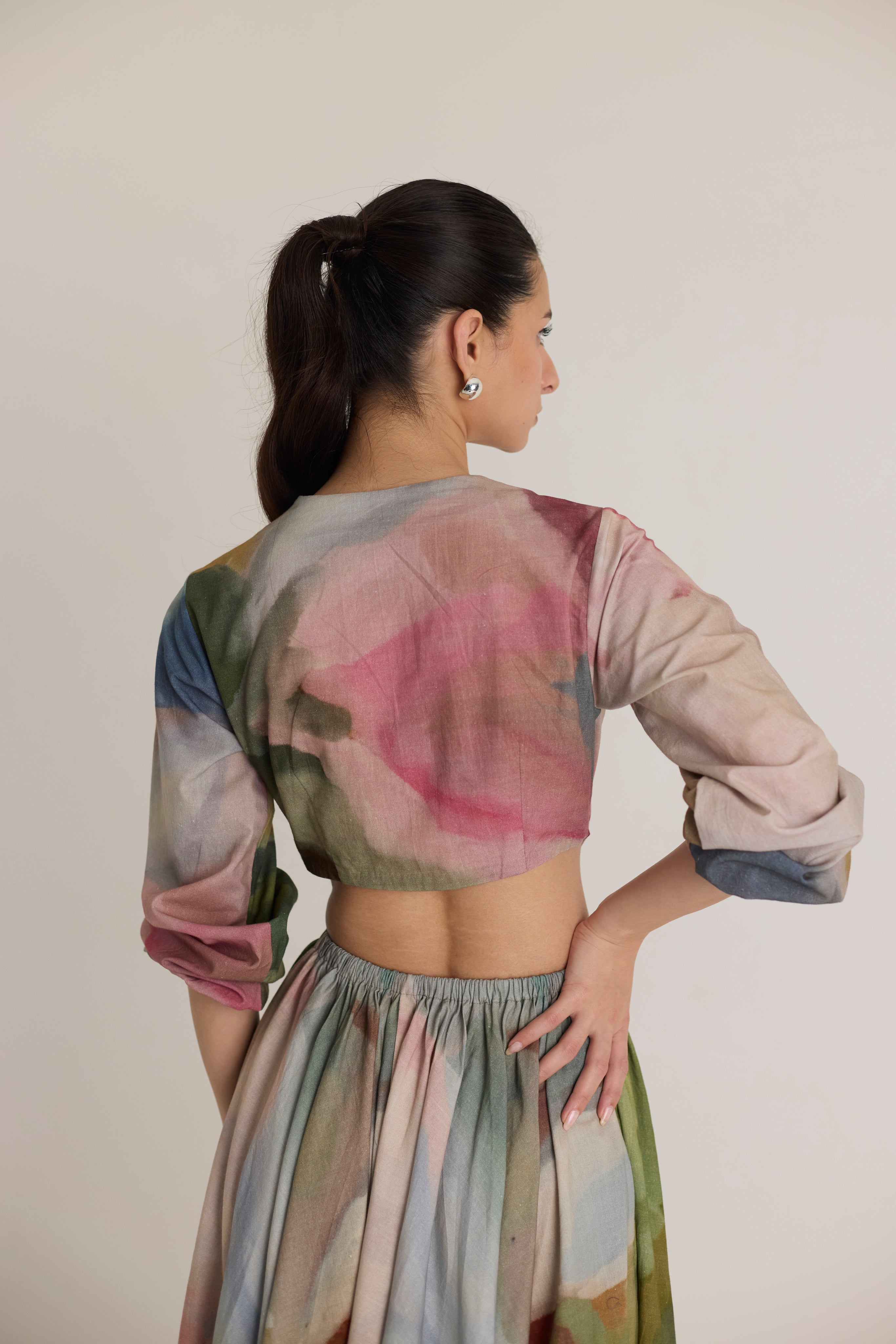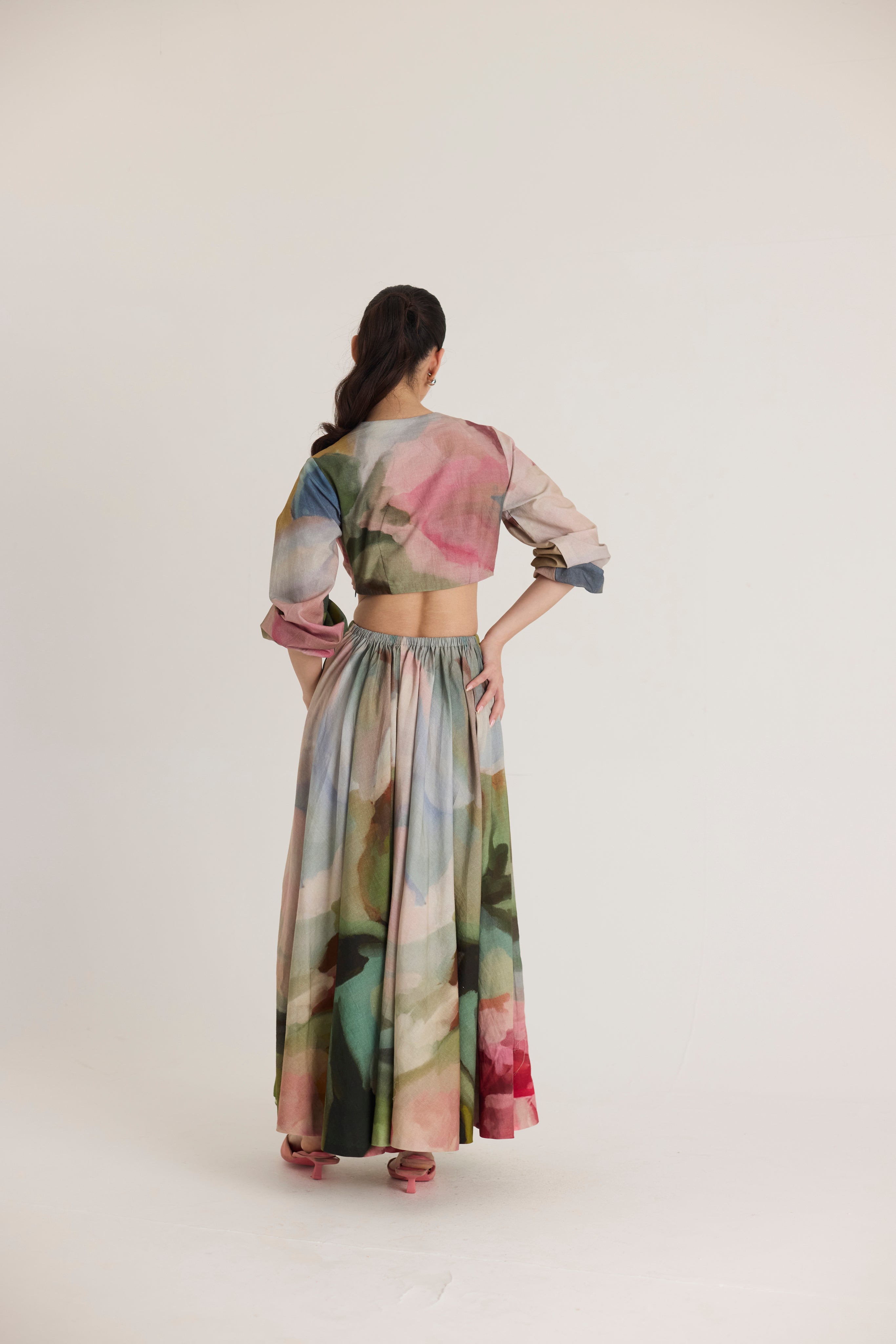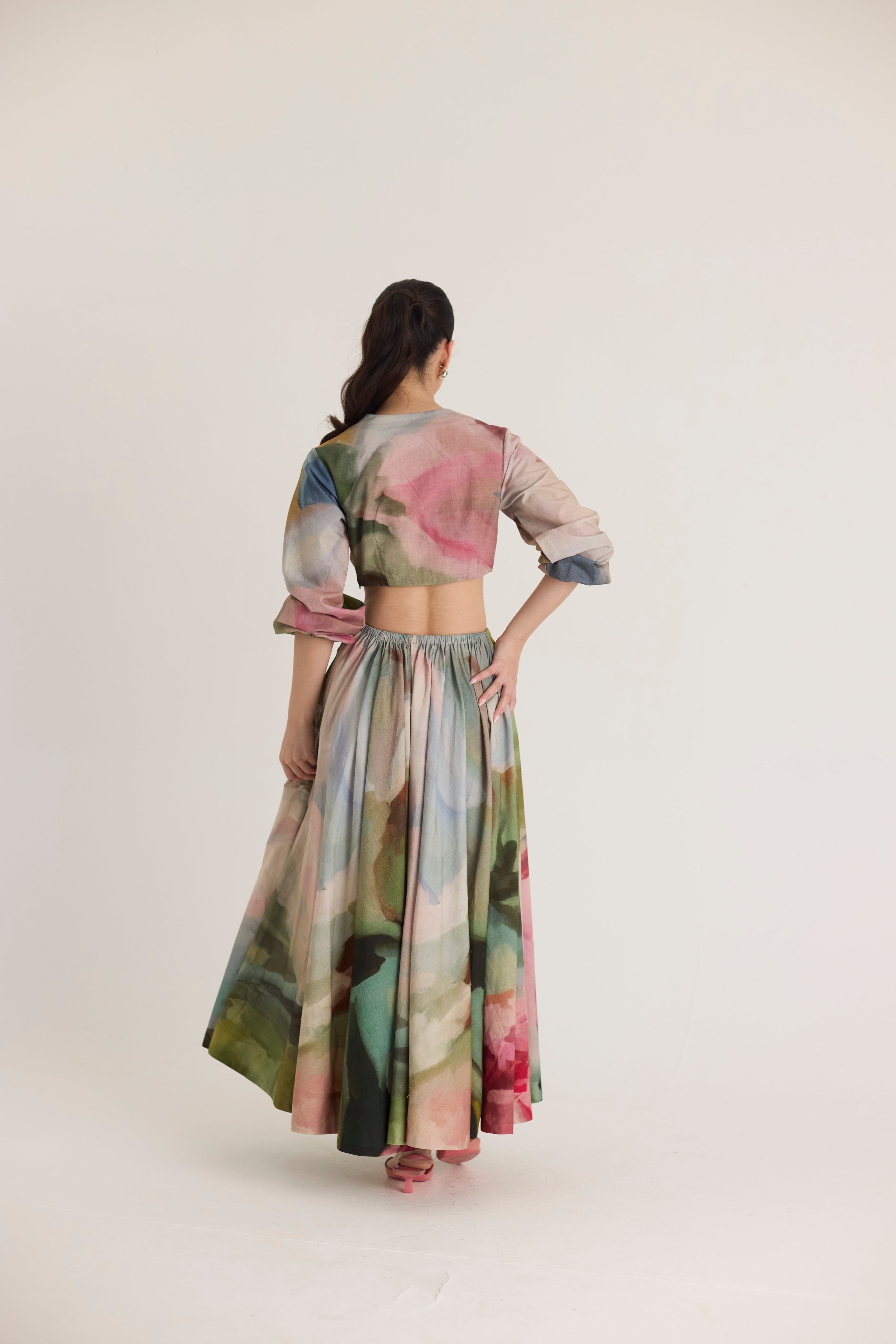 This captivating maxi dress features an artistic abstract floral print, resembling hand-painted brushstrokes in lush greens, deep reds, and muted neutrals. The dress is designed with a flowy silhouette and an elegant side cutout, adding a modern, playful touch while enhancing the waistline. Crafted from a lightweight, breathable fabric, it ensures effortless movement and comfort.