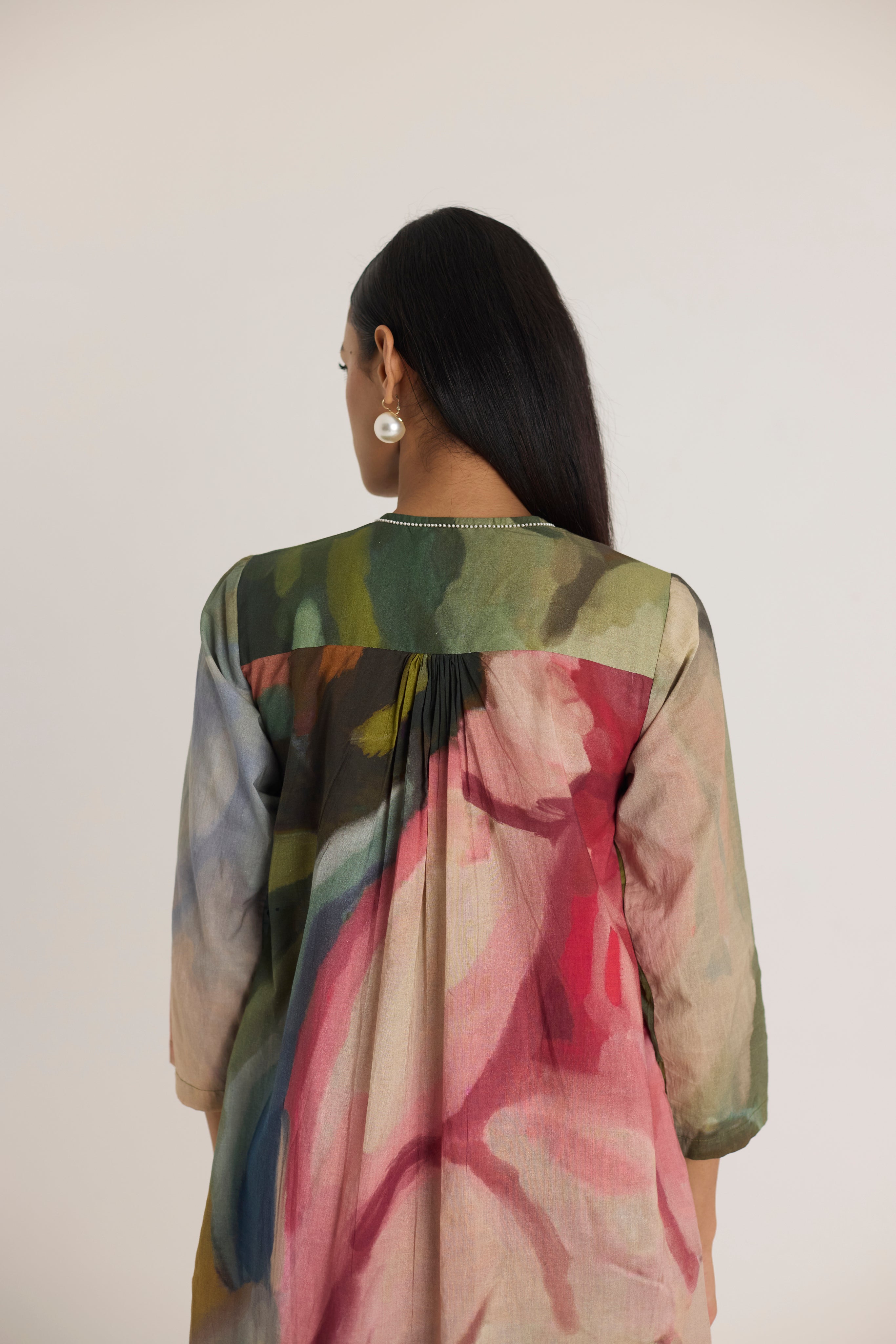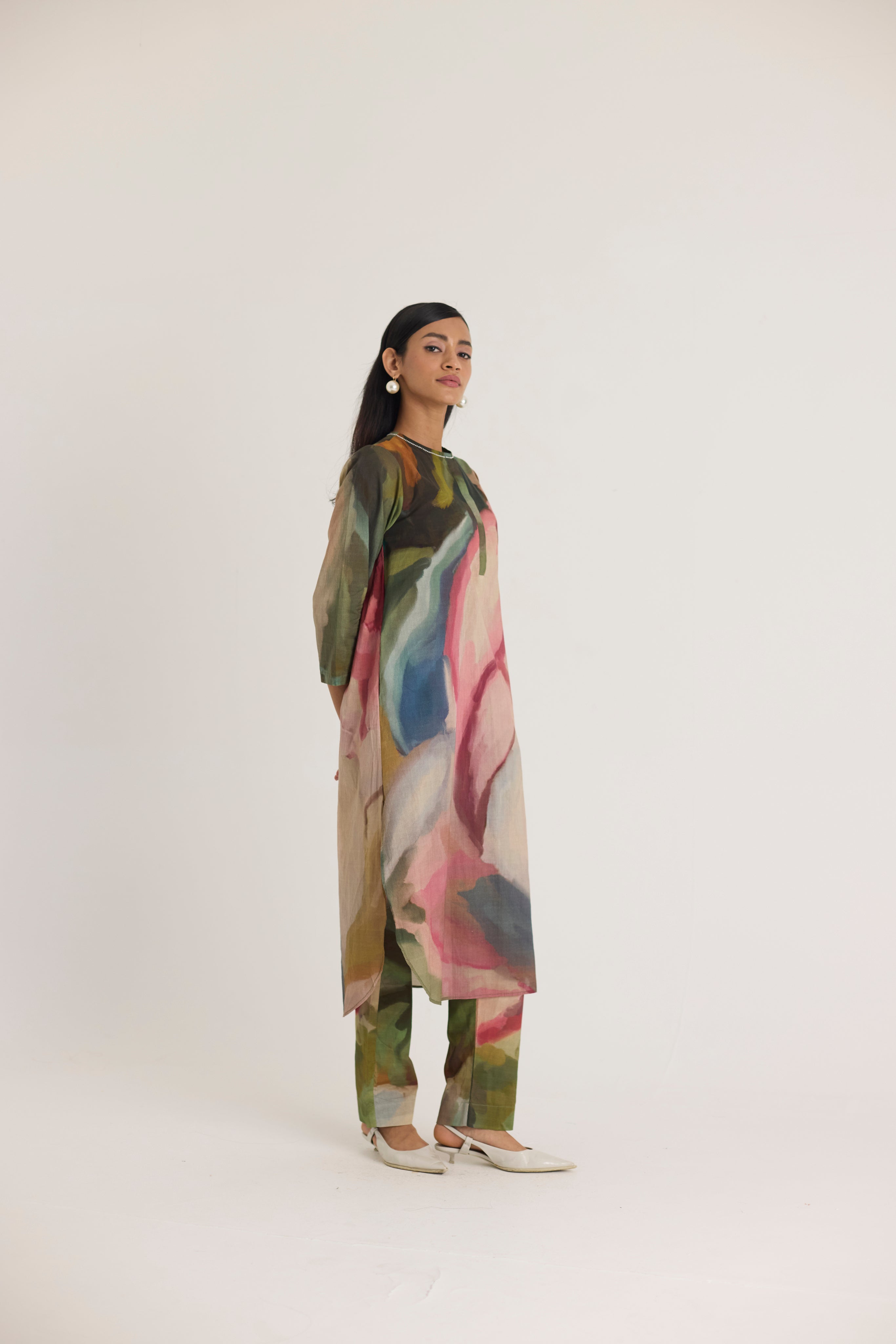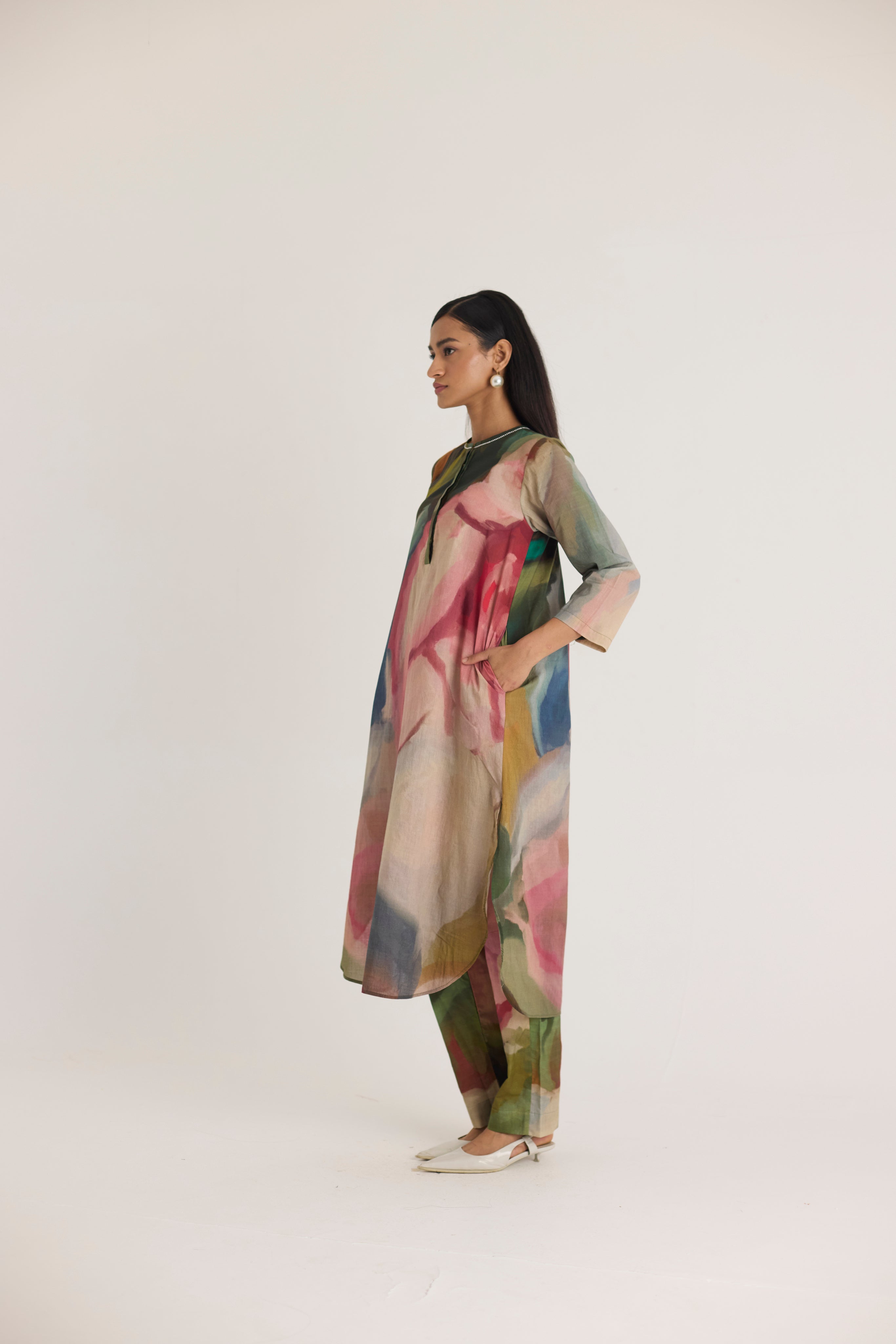 Elevate your wardrobe with this elegant, flowy kurta set, featuring a mesmerizing abstract floral print. Designed for effortless sophistication, this ensemble blends modern aesthetics with traditional silhouettes.