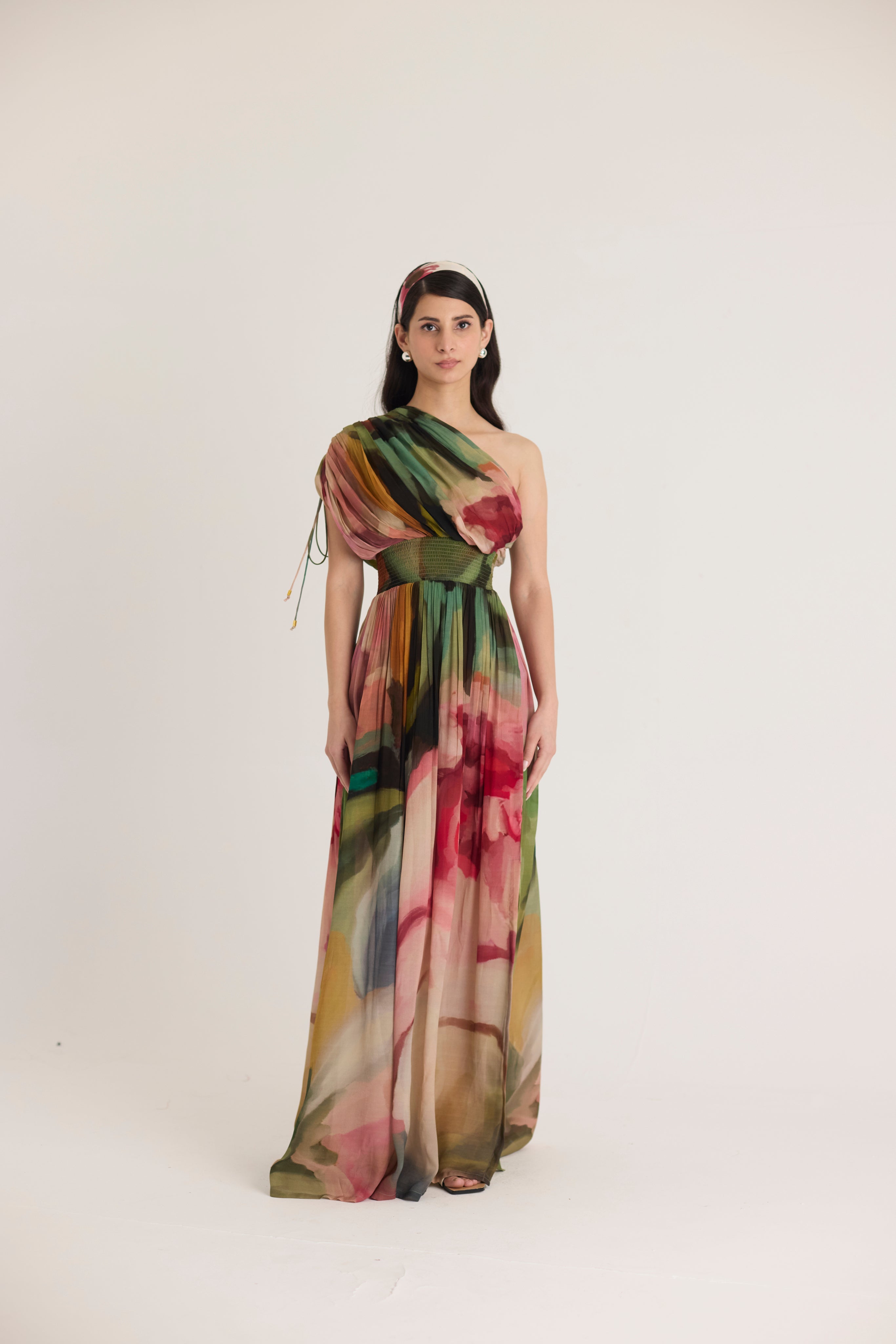The dress is adorned with an abstract watercolor-inspired print, blending rich forest greens, deep reds, warm ochres, and soft pinks in a fluid composition. The artistic brushstroke effect adds depth and dimension, creating a dreamy, painterly aesthetic that feels both bold and ethereal.