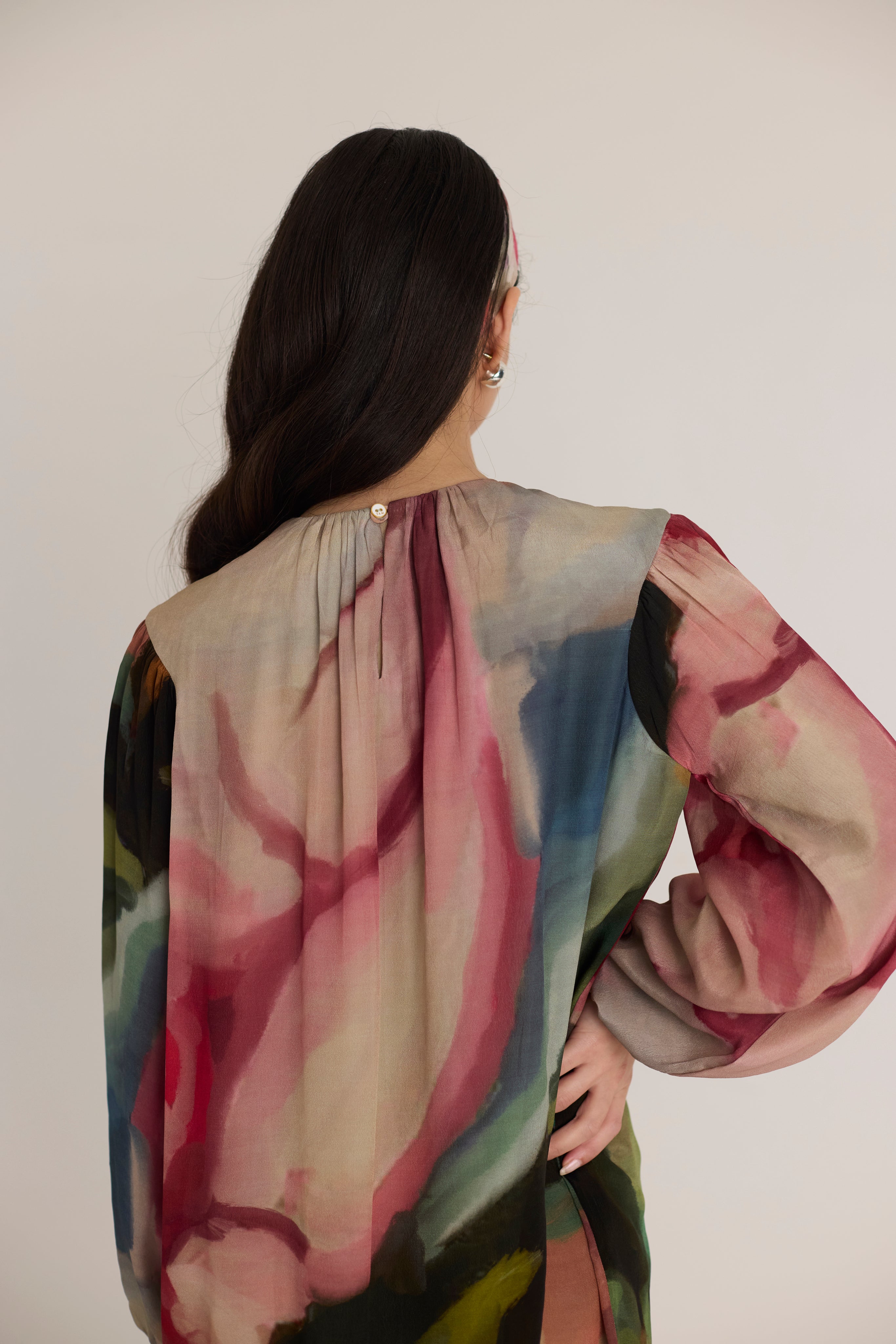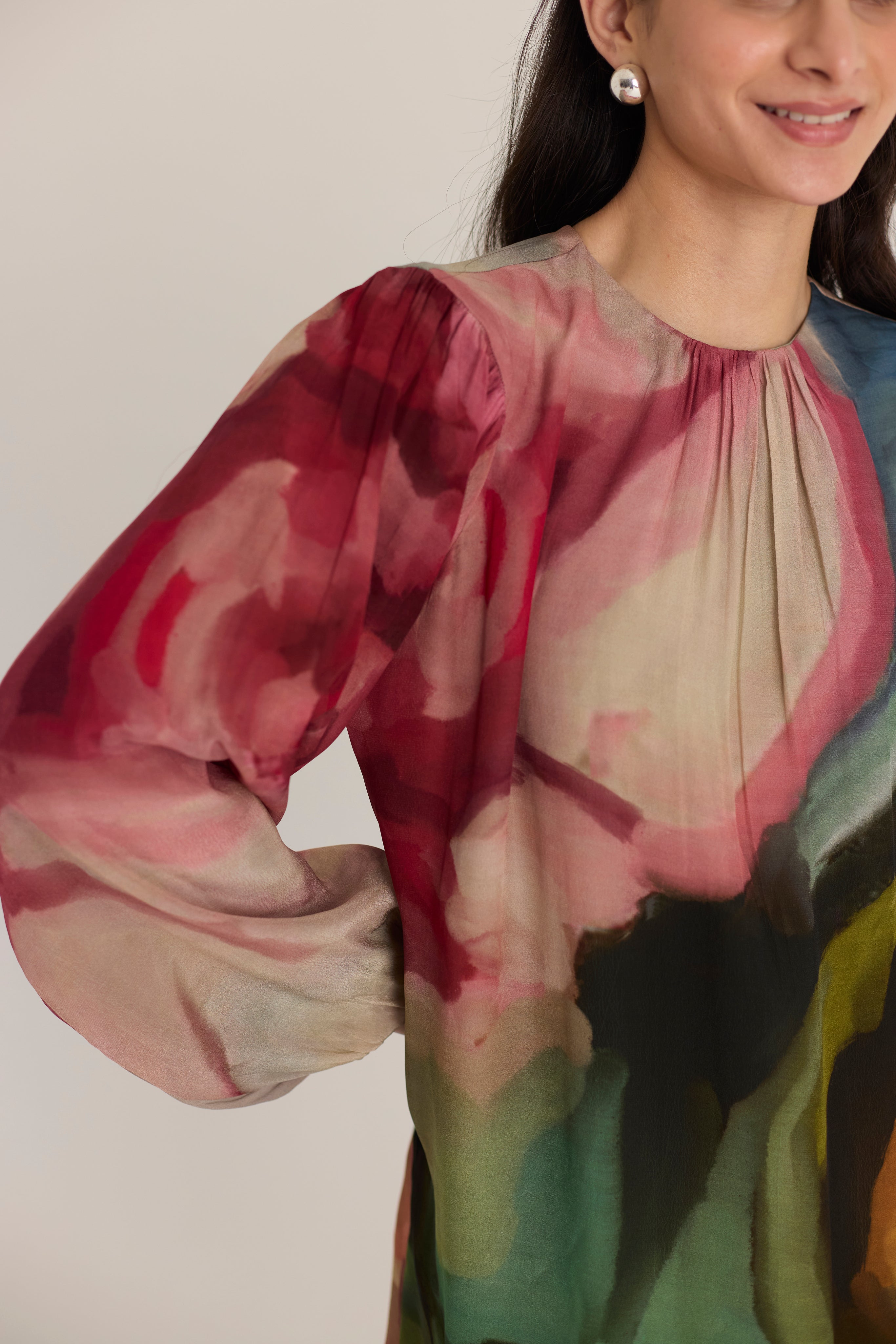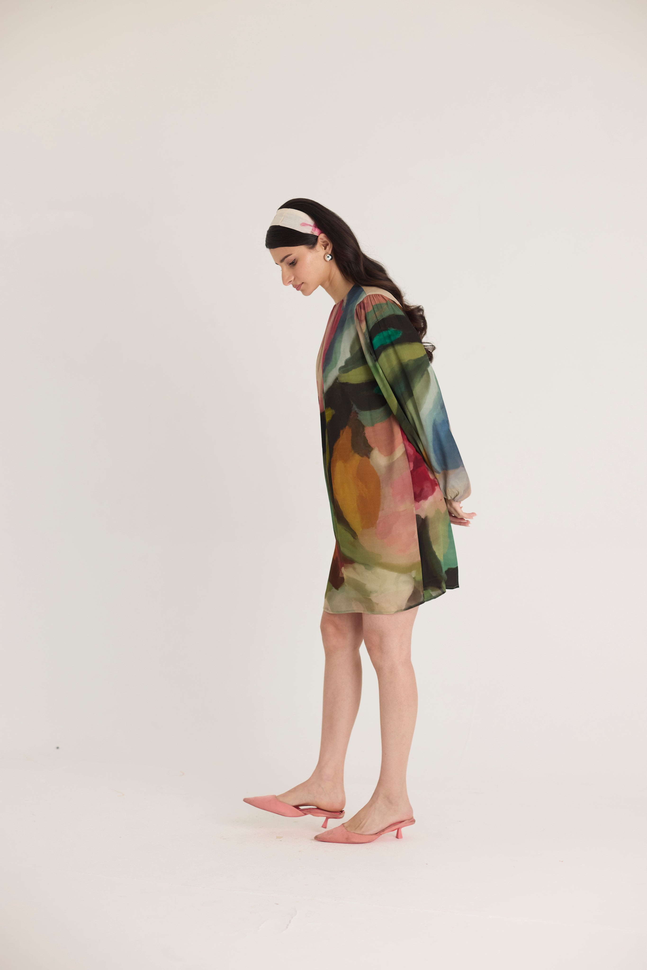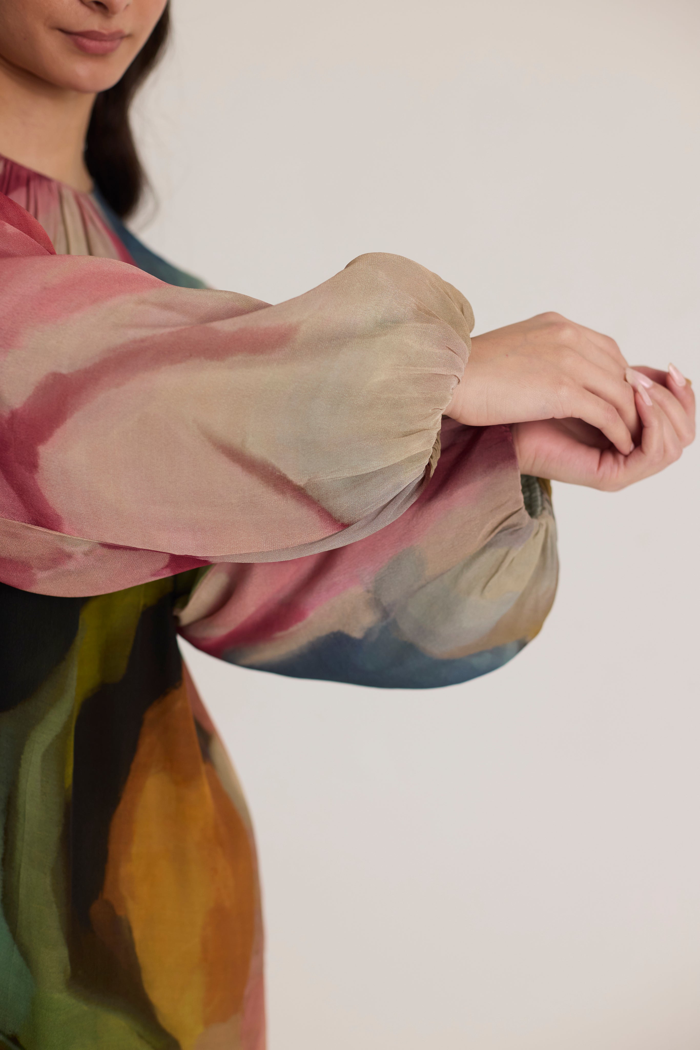 A mesmerizing watercolor-inspired print in rich hues of deep crimson, lush green, golden ochre, and midnight blue seamlessly blend together, creating a dreamy, hand-painted effect. The print flows like an abstract painting, giving the dress a one-of-a-kind artistic appeal.