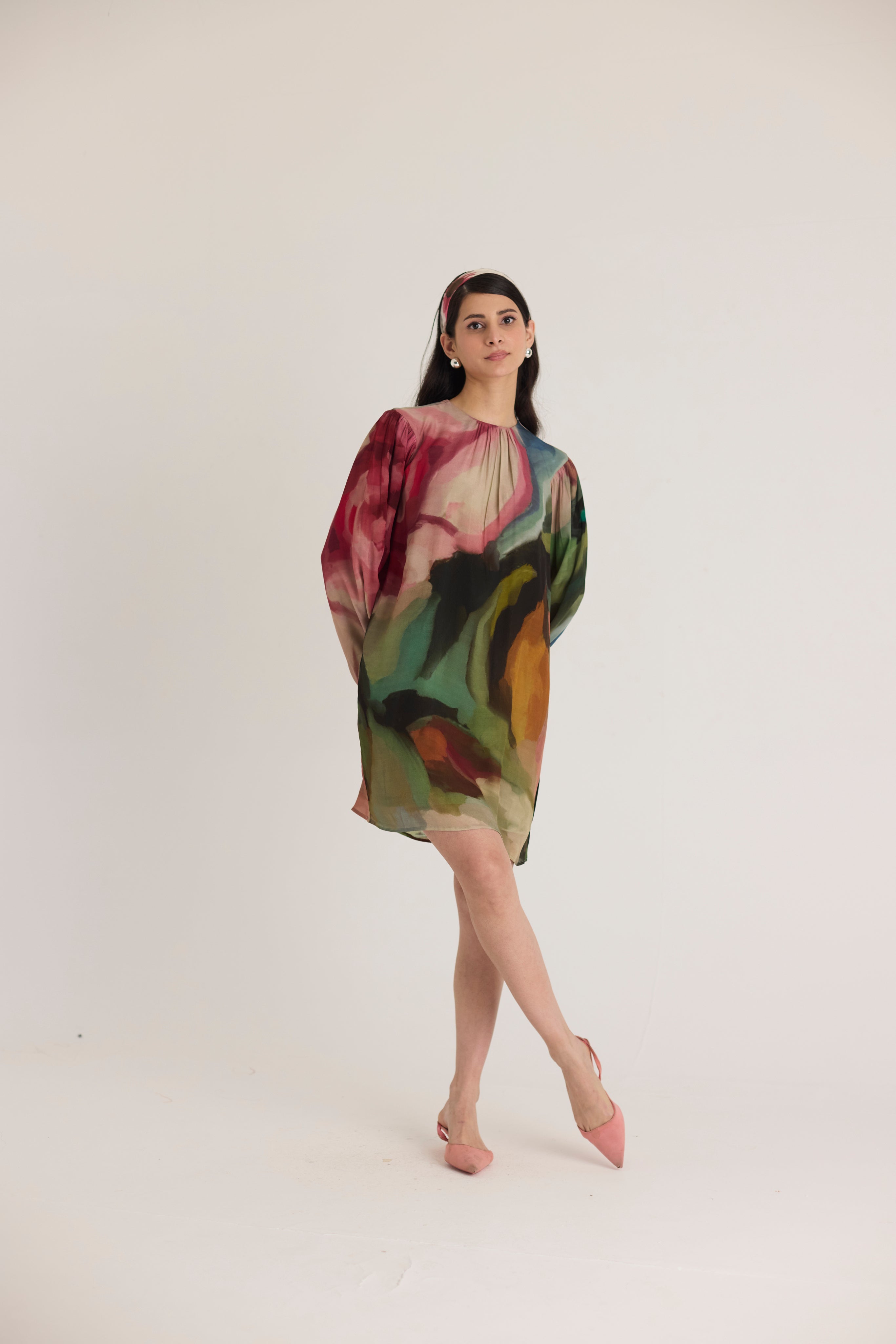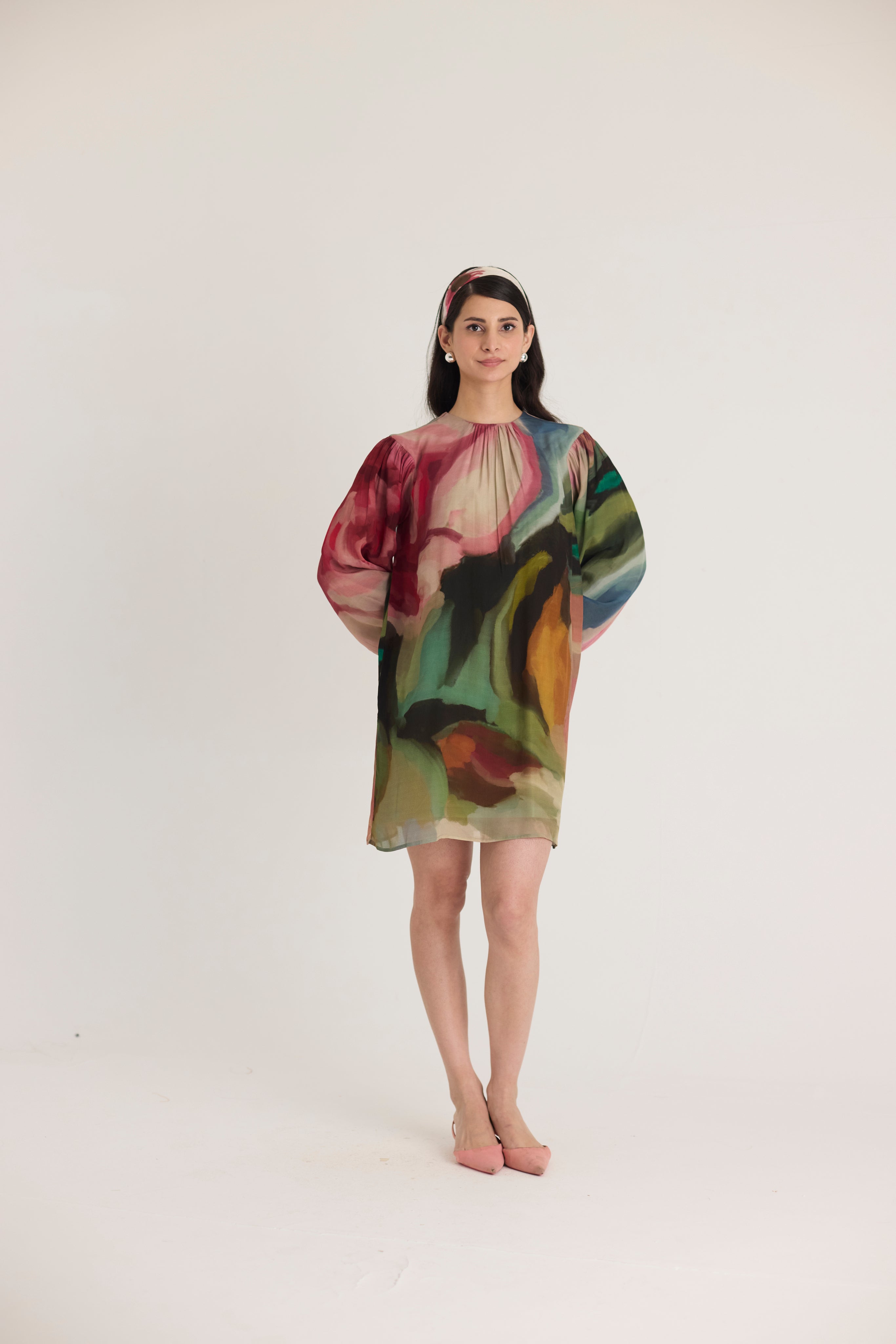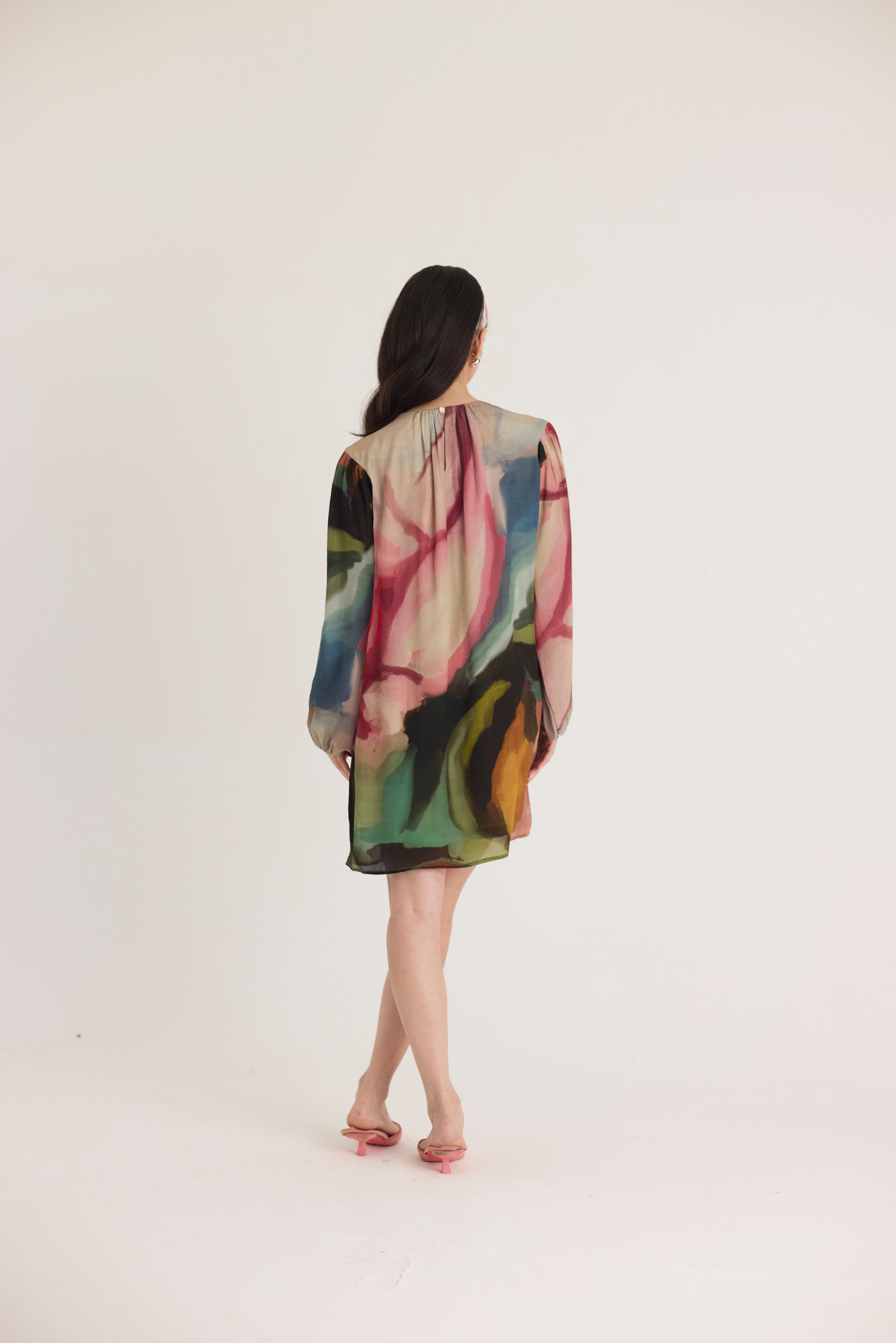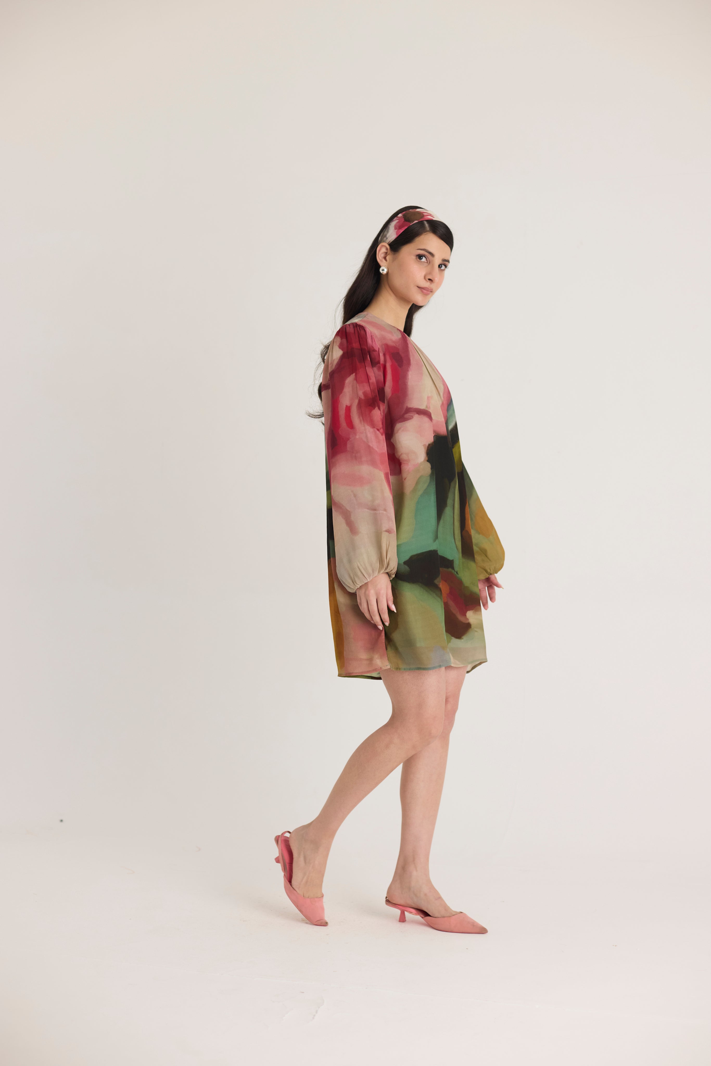 Immerse yourself in the ethereal beauty of our Watercolor Dream Puff-Sleeve Mini Dress, a lightweight and effortlessly chic piece that exudes grace and sophistication.