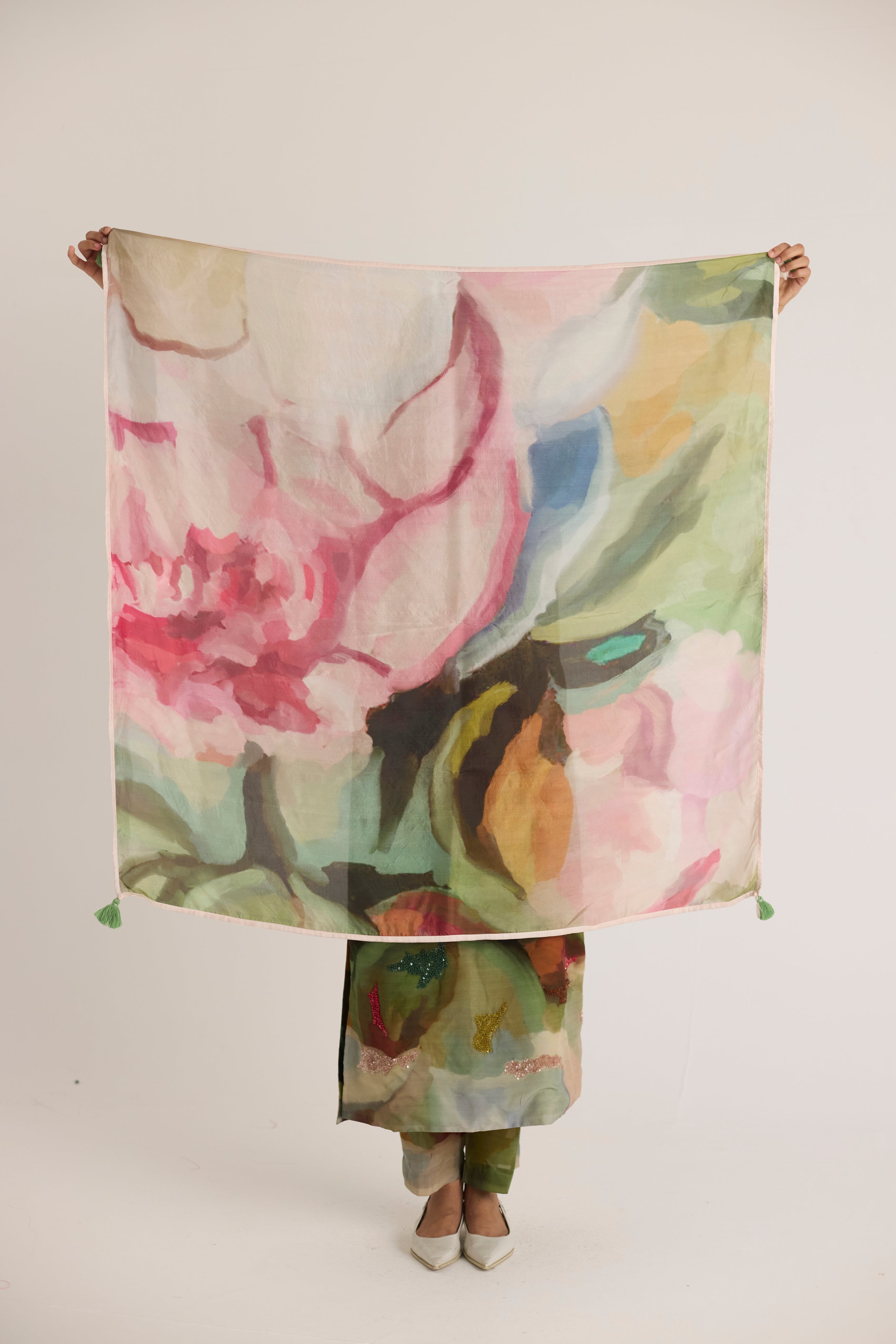 This ethereal scarf showcases a hand-painted floral watercolor print, blending soft pinks, lush greens, warm yellows, and deep earthy hues. The fluid brushstroke effect creates a dreamy, artistic aesthetic, making it a statement accessory for any wardrobe. The delicate tassel accents at the corners add a subtle touch of detail, enhancing its elegant charm.