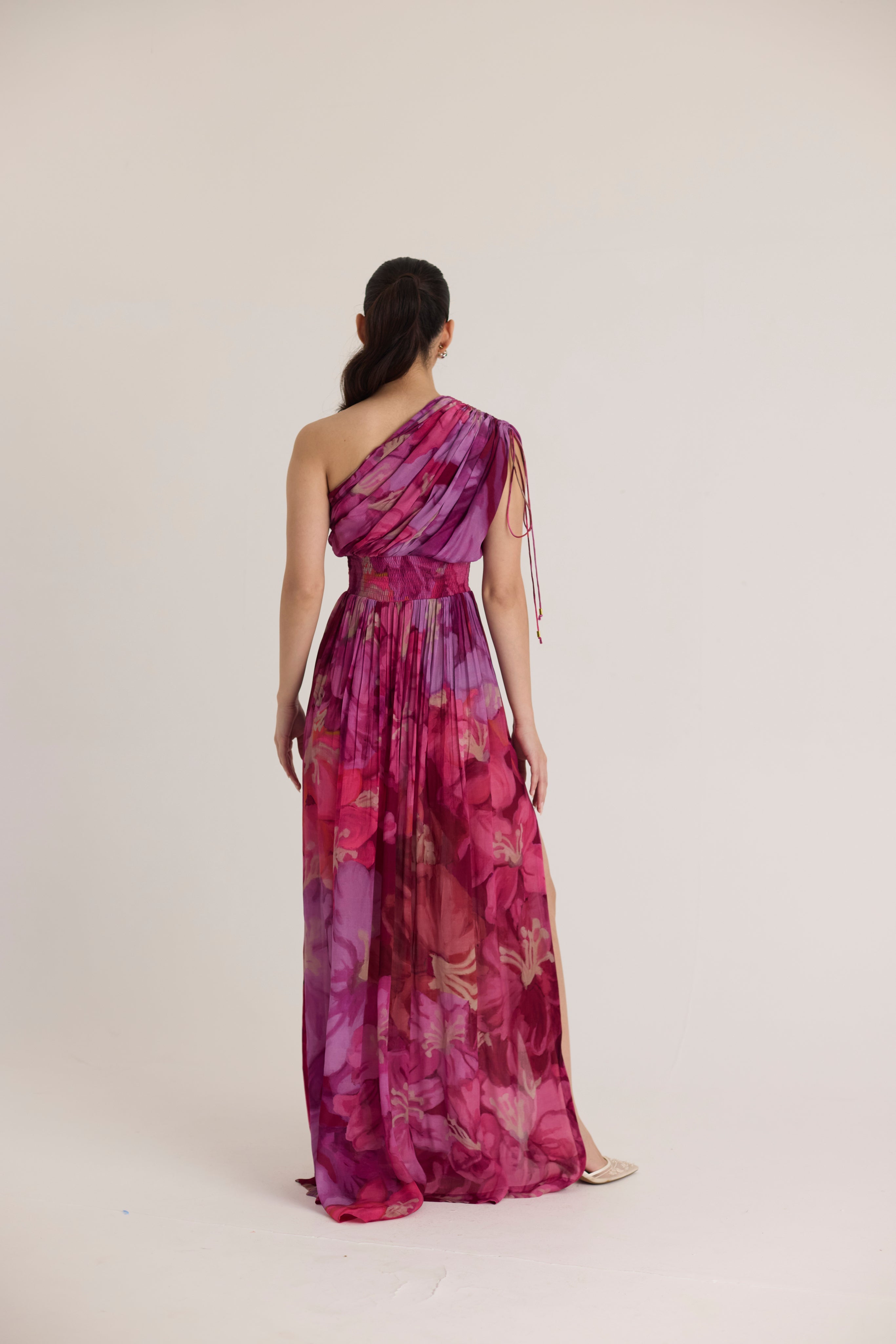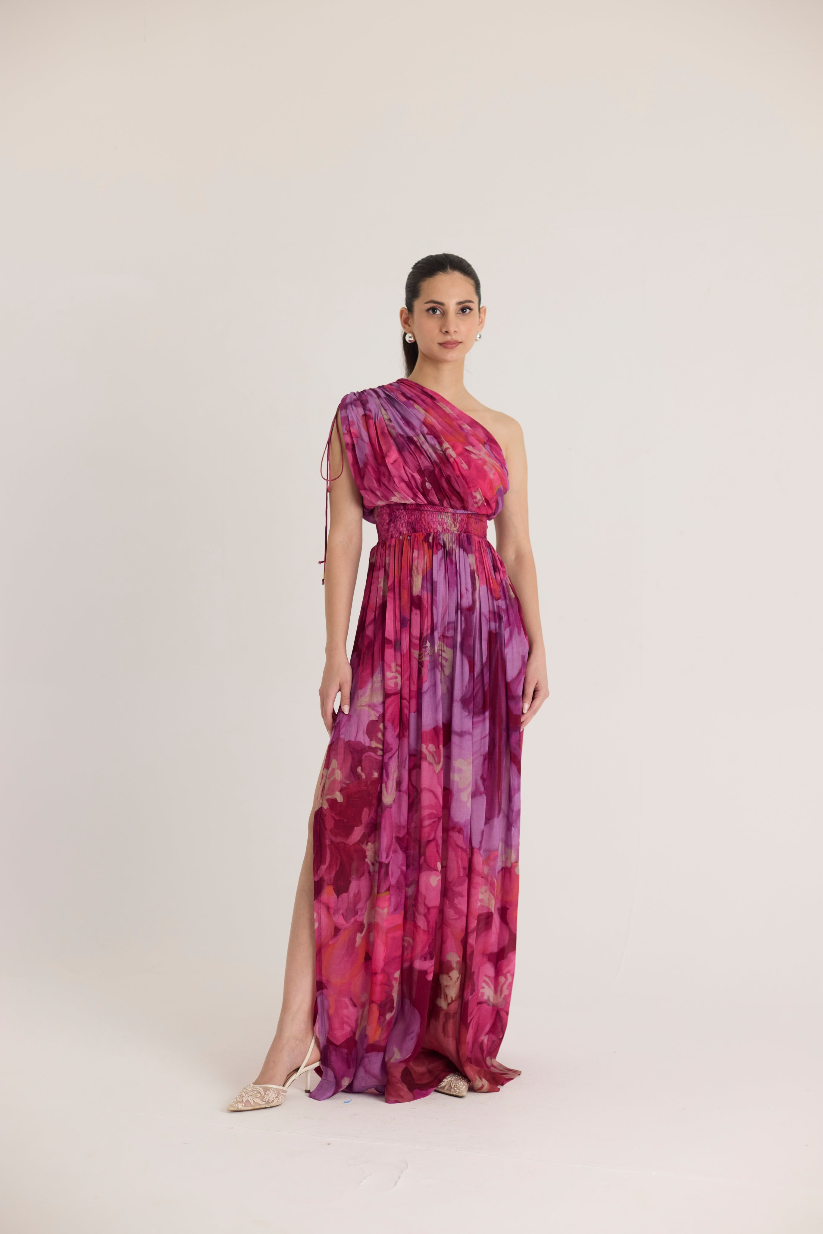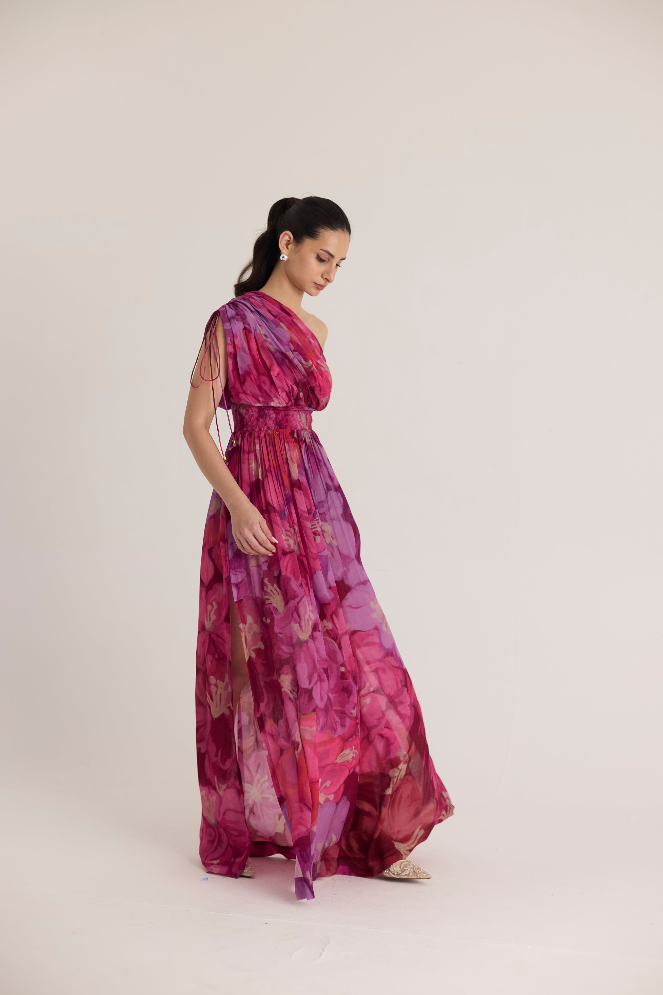 A stunning one-shoulder maxi dress featuring a vibrant floral print in shades of fuchsia, magenta, and purple. Crafted from lightweight, flowy fabric, this dress is designed for effortless elegance. The gathered detailing on the shoulder with delicate drawstrings adds a touch of romantic draping, while the smocked waistband cinches at the waist for a flattering silhouette.
